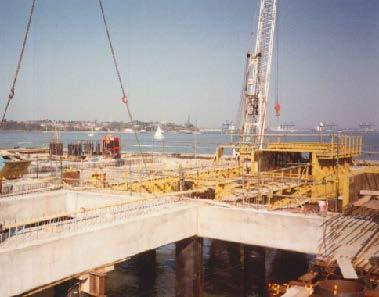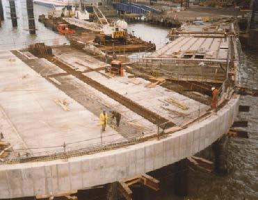 Kilnbridge were contracted to construct the new berthing facility over installed piles. The works included the design and installation of temporary works to piles to support the steel girder plate formwork and form reinforced concrete beams between piles. Precast slabs were used as permanent formwork and to provide a working deck for the installation of reinforcement for the cast in-situ slab. Heavy lifting plant as well as access pontoons and crane barges where used.
