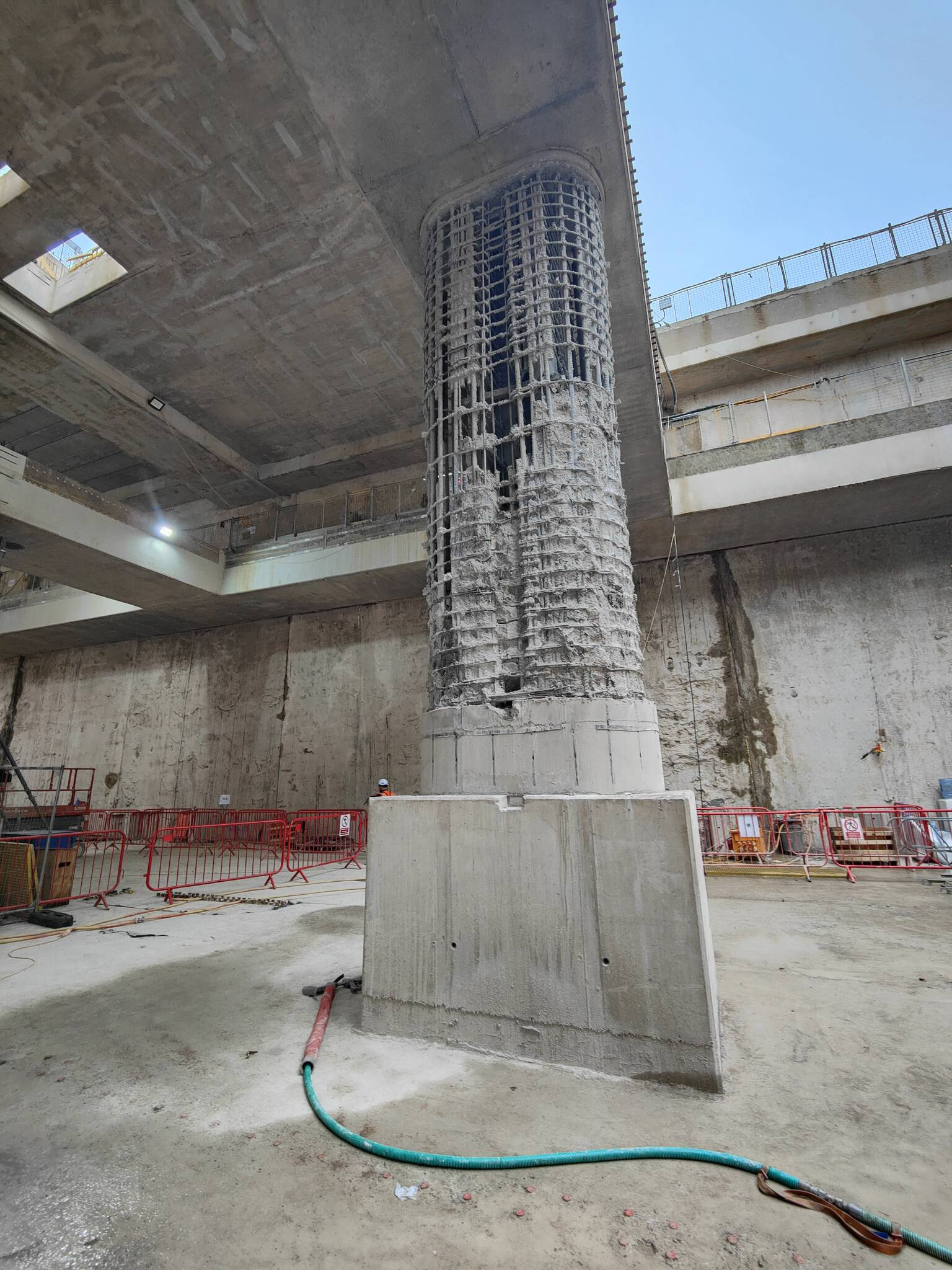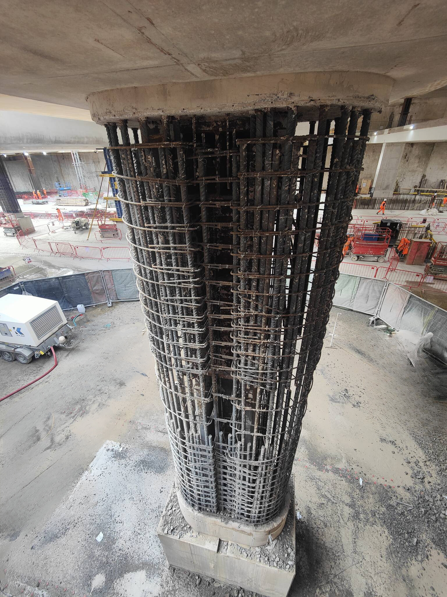 In May 2024, our Concrete Cutting and Controlled Demolition business was contracted to remove defective concrete from within a 1.50m diameter plunge column 4m high.  This appointment was due to our use of hydrodemolition techniques and capabilities, allowing for precision targeted removal of concrete with minimal damage to surrounding structural features. The high concentration of reinforcement would have made it difficult to remove the concrete within the centre of the column through any other methodology. Through expert delivery, the reinforcement and couplers were left entirely undamaged.