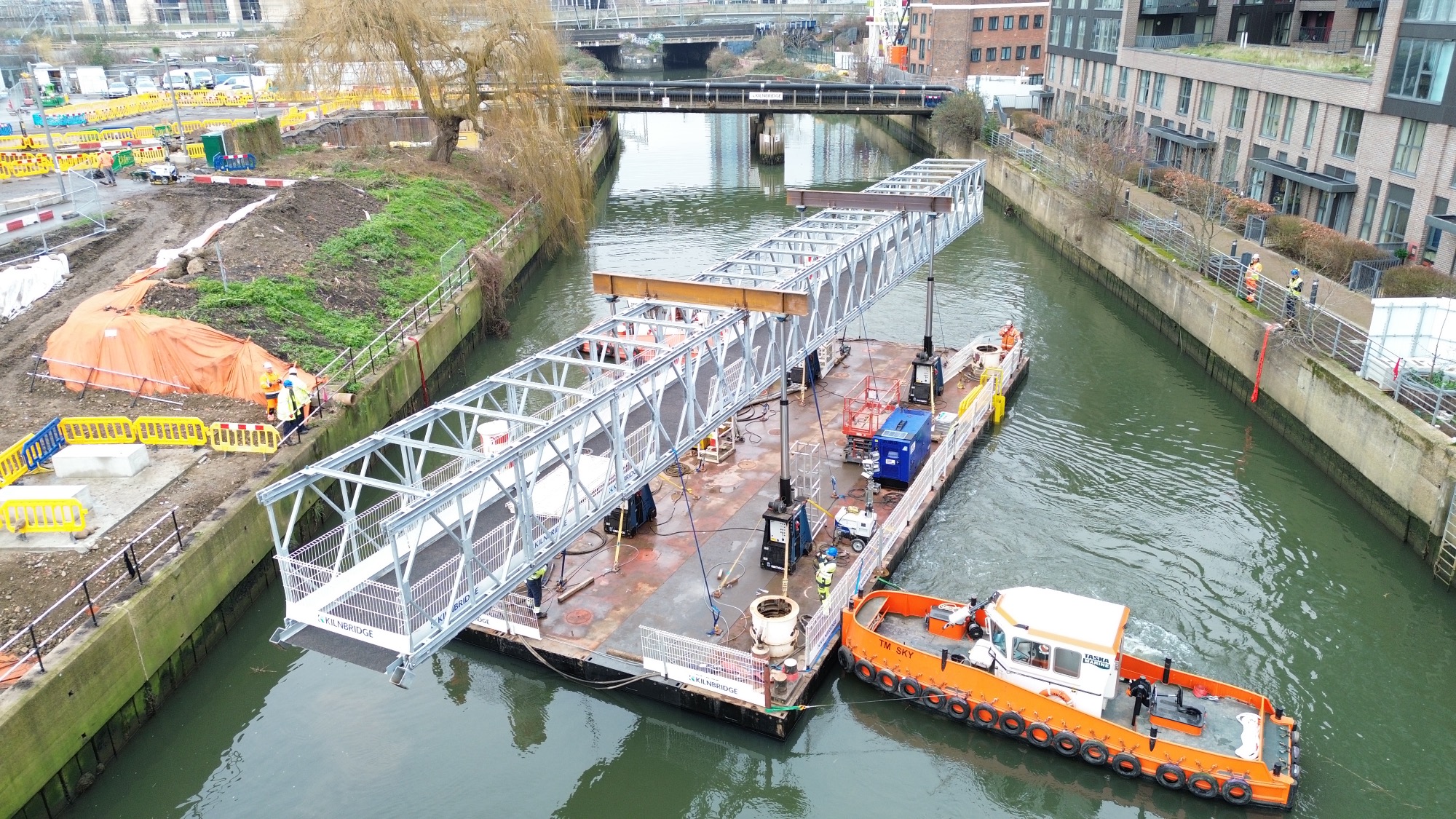 Given the limited access and lack of space for cranes, a marine-based installation was the only viable option. The bridge was assembled on a pontoon, floated into position and jacked down onto its abutments. The team’s previous experience on similar projects and strong partnerships with specialist suppliers made this complex method both possible and efficient.